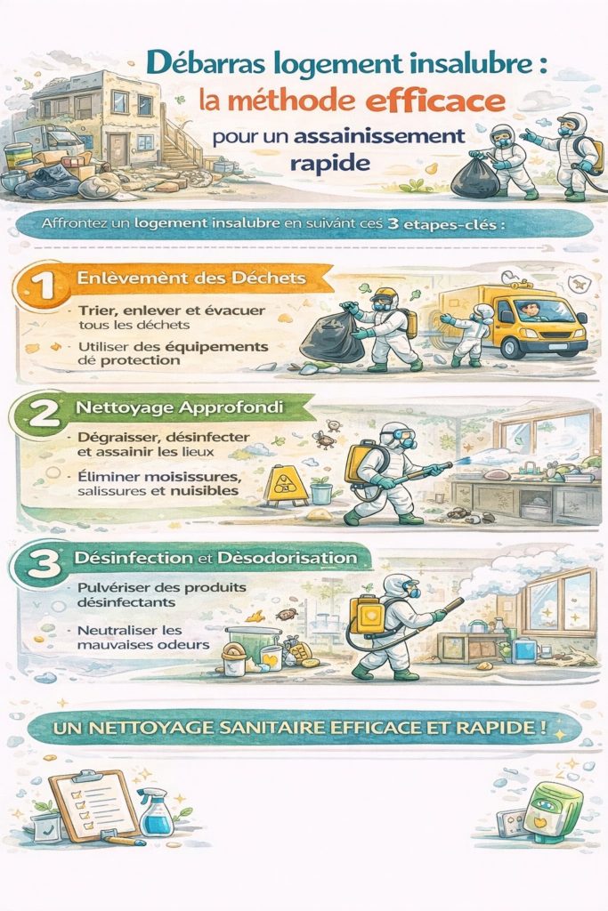 Vider un logement insalubre implique avant tout une Ă©valuation prĂ©cise de la situation. DĂ©barras, rĂ©habilitation, rĂ©novation, nettoyage, dĂ©sinfection, dĂ©sinsectisation ou dĂ©ratisation, chaque Ă©tape s’inscrit dans une dĂ©marche de remise en conformitĂ©. L’objectif est d’assurer la salubritĂ© et la sĂ©curitĂ©, tout en respectant les rĂ©glementations existantes. Cette succession d’interventions dĂ©montre l’importance accordĂ©e Ă la rĂ©habilitation d’un logement insalubre ou vĂ©tuste. Nettoyer, oui, mais aussi rĂ©nover, dĂ©sinfecter, dĂ©sinsectiser, rendre respirable ce qui, hier encore, ne l’était pas. Ce type d’opĂ©ration montre combien la question du logement insalubre demeure un enjeu de santĂ© publique majeur.