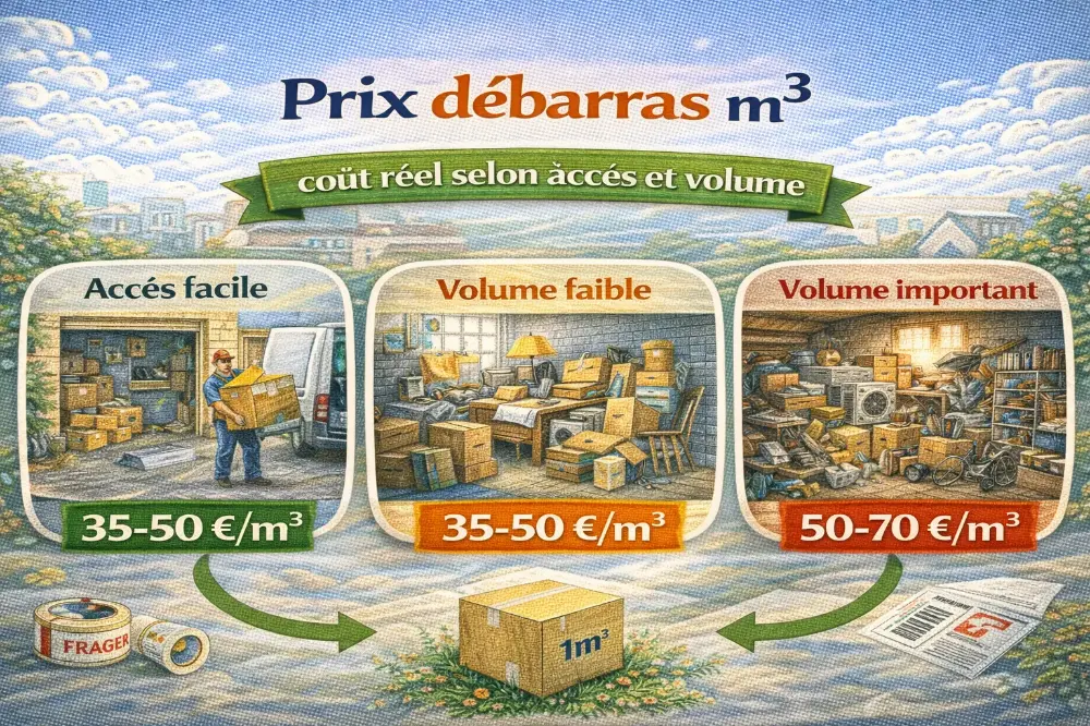 Le tarif au m³ pour un vide maison dépend surtout du volume, de l’accessibilité et de la nature des objets présents. En moyenne, un débarras standard se situe entre 40€ et 60€ du m³, ce qui sert de repère rapide pour chiffrer une intervention. Si l’accès est compliqué, si des escaliers sont à franchir ou si des éléments lourds sont à évacuer, le prix augmente. À l’inverse, la récupération d’objets de valeur peut compenser une partie du coût. Il est recommandé de mesurer le volume ou de faire établir un devis précis sur place, et vérifier les modalités de tri.